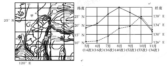 4、单选题 左下图是西太平洋某岛屿附近的海底地形图(等深线单位:米),右下图是西太平洋台风转向点的平均经纬图,影响我国的台风有西移、西北移、转向三种移动路径,其中转向路径台风常到达我国东部海面或我国沿海地区登陆后转向东北方向,路径呈抛物线状。括号内是台风统计次数,实折线上各点表示纬度,虚折线上各点表示经度。读图,完成下列各题。