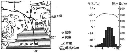 黄麻适合在湿热的气候环境中生长。收货的黄麻在水中浸湿后,才能进行初加工以获取制作麻袋、麻布、纸张等的原料。下面左图中甲城市为世界最大的麻纺织工业中心,也是该地区联系河运和海运的重要港口。右图为甲城市的气候资料。