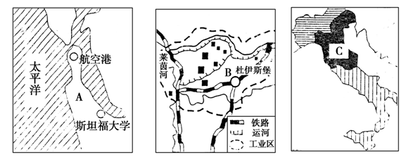 (1)A地是世界高新技术工业的先驱和典范,以_______工业为主导,试结合图中信息分析其区位条件:?;?;