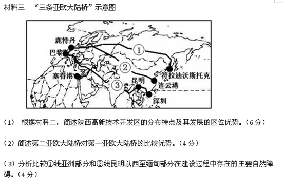 本题解析:本题考查区域地理的综合分析。(1)直接从图示反映高新技术中心的分布特征主要从河流的位置和与大城市的关系分析。区位优势主要从影响高新技术中心分布的因素:科技、交通、政策、市场等方面分析。(2)影响交通线建设优势的因素主要从地理位置(纬度位置);距离和运输时间和沿线通过的国家和城市(市场)等因素分析。(3)影响交通线建设的自然因素主要从气候、地形、地质条件、土壤等因素分析,注意结合当地的实际。
