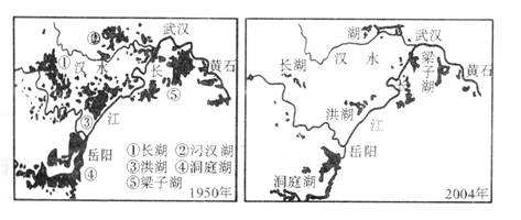 1.与1950年相比,2004年长江中游湿地面积大大缩小,其主要原因有