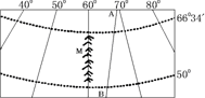 本题解析:本题考查晨昏线的综合运用。根据AB为一段晨线分析晨昏线的特征:越往北昼越短,此时为北半球的冬半年。A项,此时明显晨线与经线相交。错误。B项,时间计算,读图大概找出晨线与赤道的交点为6时,于是60°E略大于6时。故新的一天大约自30°W---180°,超过12个时区,正确。