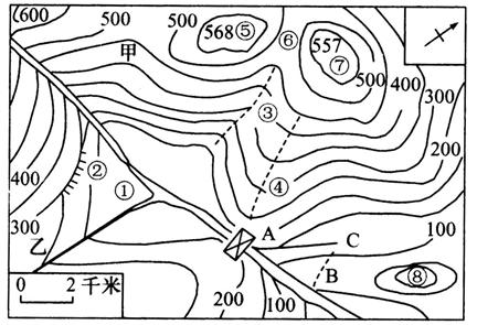 (2)⑤、⑦两地的相对高度为 米,若两地图上水平距离为2.3厘米,其实际水平距离是 千米。(2分)