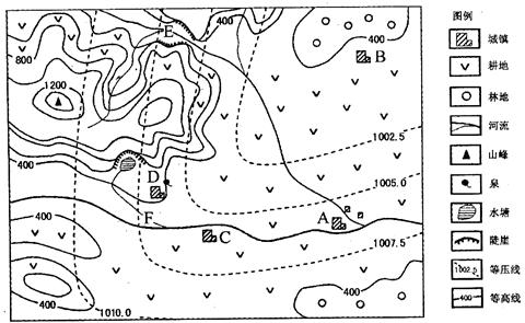 (1)根据等压线(虚线)的分布,画出过A地并与两侧等压线平行的等压线,过A地垂直于等压线由高压指向低压画出水平气压梯度力,根据题意该题所示的是我国位于北半球,风向北半球向右偏,画出风向,可得出此时A城镇风向是西南风。