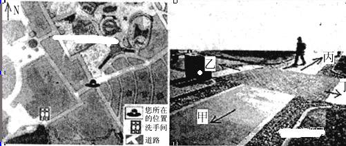 5、单选题 2012 年 10 月下旬上午 9 时,某同学在长江三角洲地区一公园游玩,下图中左图为公园内十字路口附近的导游图,右图为该同学在此路口处的留影。 据此回答下列问题。