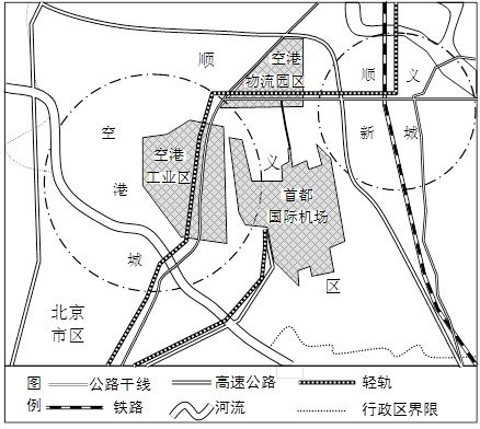 (2)影响工业区位的因素有:土地、原料、动力、水源、交通运输、劳动力、市场和政府政策等。根据图示:顺义空港工业区靠近首都国际机场和高速公路,航空、高速公路等高速交通发达;靠近北京市区,科技发达;位于郊区,地价便宜;政府支持;环境优美。