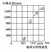 小题1:广州位于珠江三角洲地区,地势平坦,不容易发生滑坡等地质灾害。根据地球的自转速度和降水量判断①为圣地亚哥;②为广州;③为乌鲁木齐;④为吉隆坡。所以本题选择B选项。