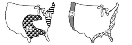 4、单选题 图中阴影①—④代表不同的灾害类型,读美国本土主要自然灾害示意图,回答下列各题。