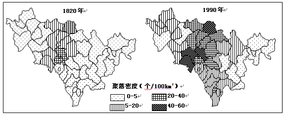 1.图中聚落密度越大的区域2.从1820年到1990年吉林省的聚落密度有显著变化,其主要影响因素有