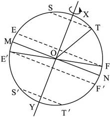2、综合题 图上XOY为地轴,MN为赤道,EF、E′F′为回归线,ST、S′T′为极圈。据图完成下列问题。