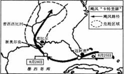 小题4:从图中可以看出,8月28日,新奥尔良市位于飓风北部,受其影响新奥尔良市的风向为东北风。