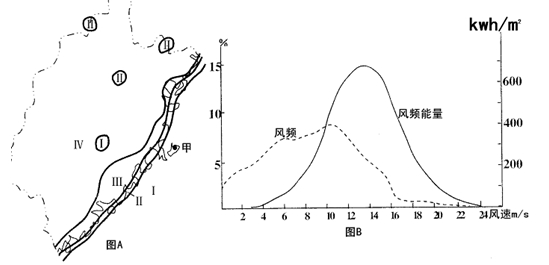 1、单选题 图A是我国沿海某省风能区划图,Ⅰ、Ⅱ、Ⅲ、Ⅳ分别表示风能丰富区、风能较丰富区、风能可利用区和风能贫乏区,图B是甲地全年各级风频和风频能量图,据此回答1-2题。