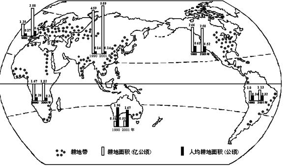 (2)比较亚洲与大洋洲耕地面积在数量上的差异和1990~2001年耕地面积变化的差异。(9分)