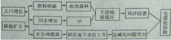 1、单选题 读“新疆和田地区人口增长、耕地扩大所产生的影响关联图”,完成26~27题。