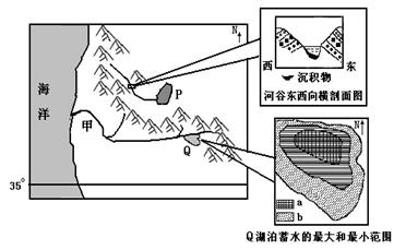 5、多选题 下图为某区域图,图中右侧分别表示乙河流局部河谷剖面示意图和Q湖不同季节的蓄水面积分布图,读图回答问题。