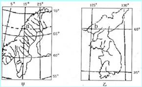 1.甲半岛是斯堪的纳维亚半岛,该山受冰川作用影响在西北部多形成峡湾,海岸线非常曲折;朝鲜半岛的北部是长白山,该半岛南部被海包围,气候受海洋影响很大,由南向北大陆性逐渐增强;两个半岛都以山地为主,平原面积狭小。