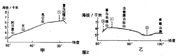 4、单选题 图2中甲图表示我国沿87°E山地雪线的变化图,乙图表示我国沿29°N山地雪线的变化.读图回答4~6题。