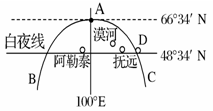 4、单选题 由于大气的散射作用,人们把黄昏的余晖与黎明的曙光相接的现象叫“白夜”,白夜线是指白夜现象发生的最低纬度。下图中弧线BAC为晨昏线。当北半球发生白夜现象范围最大时,读图回答下列各题。
