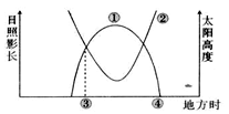 小题5:正午太阳高度大小变化和日影长短变化成反比,据图判断,白天太阳高度>0°,所以本图中央地方时为12:00,所以①为太阳高度变化曲线,②为一日内影长变化曲线;④点时刻太阳高度为0°,所以影长趋于无穷大;③地地方时小于12:00,上午影子应该朝向西北,所以C选项错误;①为当地正午太阳高度,H=90°-(α+23.5°),因为α<40°,所以H>26.5°。