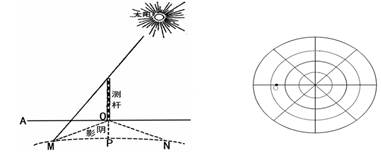 2、综合题 沈阳市某中学地理研究性学习小组在O地点进行太阳高度角的测定。左图是其观测示意图,MN弧是测杆阴影端点的连线。读图完成下列问题。(16分)