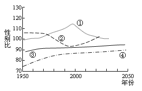 2、单选题 “性别比”为平均每100名女性所对应的男性人口的数量,右图为四条人口性别比例曲线,读图回答1-2题。