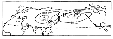 (1)此图表示北半球 季气压状况,图中A气压中心的名称: 。