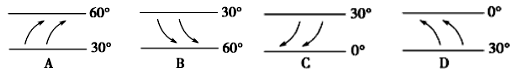 【小题2】夏季,气压带和风带北移,A风带位于地中海北部,对该地没有影响;B是南半球西风带,在其影响下,形成西风漂流,为寒流;C为北半球低纬度,D为南半球低纬度,两者之间为赤道低压带;D风带(东南信风带)越过赤道后,在地转偏向力作用下向右偏转,在南亚地区形成夏季西南风。