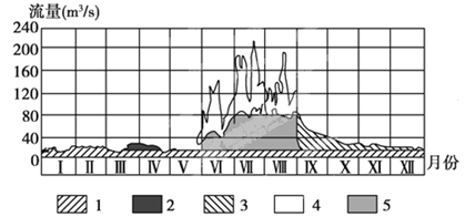 4、单选题 下图为我国某河流一水文站流量过程线补给类型的分割图,读图回答下题。