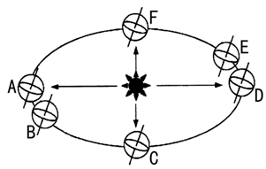 (1)在图中地球公转轨道上画出公转的方向。在F图地轴上画出自转方向。