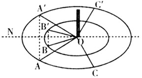 材料一:方法:第一天在地面画若干个同心圆,测得标杆顶部投影点在同一圆周上的位置分别为A、A",B、B",标出∠AOA"和∠BOB"的角平分线(如没有够大的量角器,可连接A、A",B、B",取其中点与O点连线即可),该角平分线标示正北方向。第二天记录标杆日影与正北方重合的北京时间。