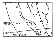 1.E地为纳米布沙漠,它沿非洲西南大西洋海岸延伸2100千米,该沙漠最宽处达160千米,而最狭处只有10千米,其沿海岸线延伸的原因是2.F自然带在此处分布的最高纬度低于35°,其主要的影响因素是3.M地为世界重要的渔场,其成因是
