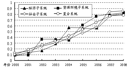 (1)试分析2000-2008年我国某城市群资源—环境—社会—经济复合系统和谐度变化特点?(6分)