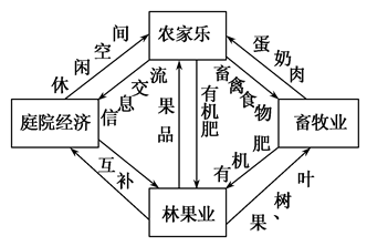 2、单选题 庭院经济是指农户充分利用家庭院落及闲置空间,从事高度集约化生产的一种经营形式。农家乐是农民向城市居民提供的一种回归自然的休闲旅游方式。读某地农业经济模式图,完成小题。