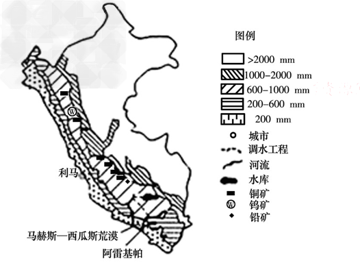 (2)据图中描述秘鲁有色金属矿分布特点并分析成因。