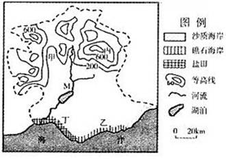 小题1:图示区域为我国北方,不适合种植柑橘;乙地为礁石海岸,不宜建设海滨浴场;丙地位于山区,不宜开荒;丁地位于海边,河流下游,地势平坦,可以建设化工基地。故选D。