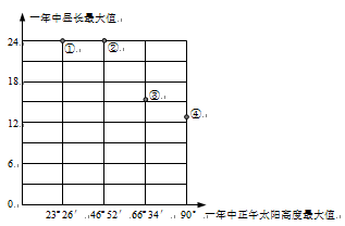 5、单选题 读四地一年中正午太阳高度最大值及昼长最大值图,完成下列各题。