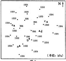 小题2:a、c、d、e四地中,可能出现降水天气的是(?)