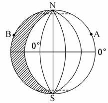 2、综合题 下图中阴影部分表示夜半球,A、B两地均处在30°N,读图回答下列问题。(10分)