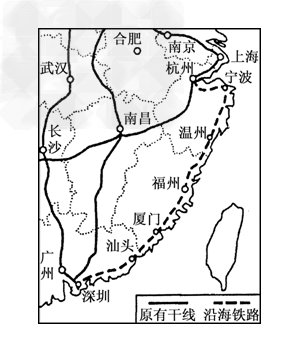 2、单选题 我国正在建设杭州到深圳的沿海铁路,它对东南沿海的发展将起到巨大的作用。读图,回答1~2题。