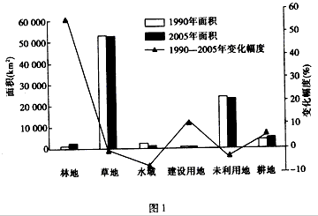 (1)该市2005年最主要的土地利用类型是____________,1990~2005年变化幅度最大 的土地利用类型是