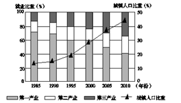 2、单选题 图为某省1985~2010年就业结构与城镇人口比重变化,据图中的信息推测下列说法正确的是?