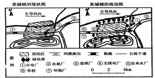 5、综合题 下图是“某城镇现状与规划图”,请根据城市功能区的合理布置原则,分析比较两幅图,回答下列问题:(10分)