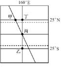 5、单选题 20W 和160E是东西半球的分界线。图中甲、丙在晨线上,此刻地球位于远日点附近。回答下题