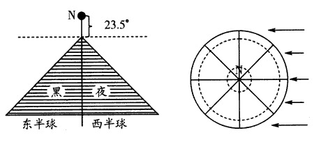 ? 绘出晨昏线、用阴影表示夜半球、标出直射点所在经线的经度)