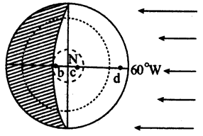 4、单选题 下图中线段ab表示全球某日某时刻的昏线, 线上数据为经度,且a点的纬度是66°34′S。据图回答3~5题。