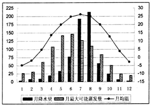 1、单选题  “最大可能蒸发量”是指地表在水分充足的条件下产生的最大蒸发量.下图是某地1961~1990年间相关统计资料图。
