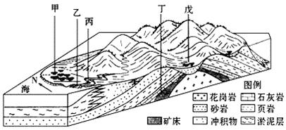 从图中看出乙位于河流的入海口,乙处为河流三角洲,A错。丙处为凸岸,河流弯曲处一般为凹岸侵蚀,凸岸堆积,因此丙处侵蚀比对岸弱,B错。丁处矿床已被侵蚀一部分,天然气为气态不可能出现这种情况,C错。戊处岩层向上拱起为背斜,从地貌上看为谷地,位于背斜谷内,D正确。