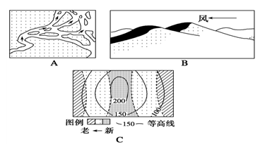 小题1:图示A为河口三角洲为流水沉积形成的典型地貌。