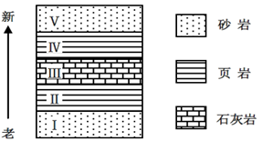 2、单选题 同一时期在海洋上形成的砂岩→页岩→石灰岩在水平方向上是从浅海到深海依次排列的。在地质时期内,海退是指海岸线向海洋推进,海进是指海岸线向陆地推进。读某海域不同地质时期(I→V)形成的地质剖面图,完成下列问题。