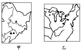 小题1:依据图示轮廓可以判断,甲地区为我国东北地区,乙地区为美国东北部地区,两地区附近均有丰富的煤铁资源,利于发展钢铁工业,在此基础上,该地区发展了机械工业、汽车工业;两地区都是本国经济比较发达的地区,人口密集,城市众多,市场广阔。